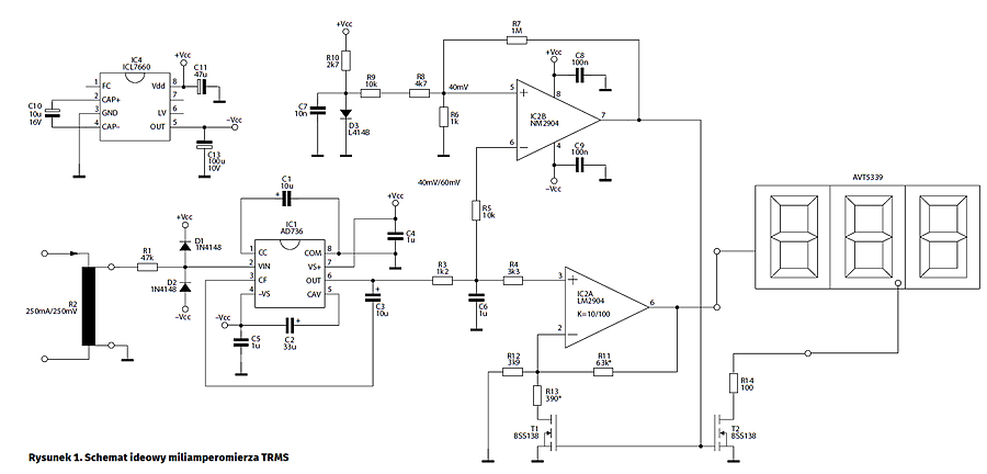W pewnym urządzeniu znajdował się analogowy miliamperomierz prądu przemiennego typu MER-96T. Wysłużony przyrząd nie mieścił się już w swojej klasie, a co gorsza miał błąd nieliniowy, więc próby kalibracji bocznika nie miały sensu. Wobec konieczności wymiany miernika postanowiłem wykonać przystawkę do kitu AVT5339 pozwalającą na pomiaru prądu przemiennego. Układ ten niewątpliwie jest tańszy od miernika analogowego, bardziej dokładny, a ponadto umożliwia pomiar wartości skutecznej prądu odkształconego.