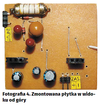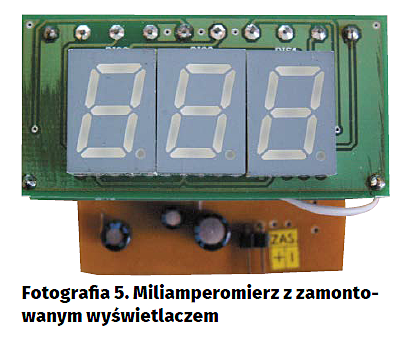 Amperomierz zmontowano na jednostronnej płytce drukowanej o wymiarach 46 mm × 44 mm, której schemat montażowy pokazano na rysunku2. W montażu pomocne będą też fotografie3, 4 i 5 pokazujące gotowy miliamperomierz. Montaż najlepiej rozpocząć od elementów SMD. Następnie należy wlutować zwory, a na końcu pozostałe elementy przewlekane. Jako bocznik prądowy można zastosować gotowy bocznik ze starego multimetru (należy sprawdzić jego rezystancję) lub nawinąć odpowiednim drutem własny. Typowy rezystor 1 V nie nadaje się, ponieważ pod wpływem przepływającego prądu będzie się nagrzewał i tym samym zmieniał swoją rezystancję.