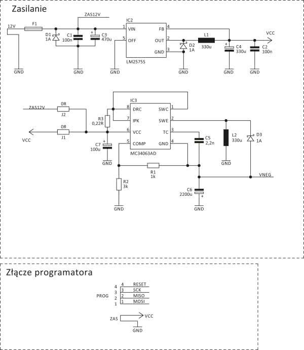 Schemat generatora pokazano na rysunku 1. Cały układ jest zasilany napięciem 12 V zabezpieczonym bezpiecznikiem F1 (500 mA). Dioda D1 zabezpiecza generator przed napięciem o odwrotnej polaryzacji. W zasilaczu zastosowano stabilizator impulsowy LM2575-5V. Do wytworzenia napięcia –5 V służy MC34063. Układ może być zasilany bezpośrednio z +12 V poprzez zworkę J2 lub z +5 V poprzez zworkę J1. Rezystor R3 ogranicza prąd maksymalny. Rezystory R1 i R2 tak dobrano, aby na wejściu komparatora COMP występowało napięcie –3,75 V (–5 V+1,25 V z wewnętrznego napięcie referencyjnego). Do obliczenia wartości elementów dyskretnych wykorzystano wzory zawarte w dokumentacji producenta. Do obliczeń można także skorzystać z jednego z wielu darmowych kalkulatorów.