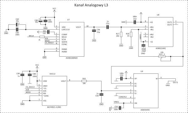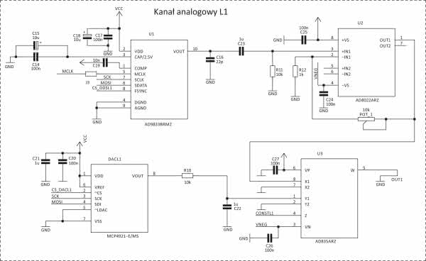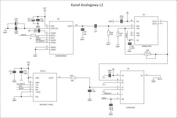 Wszystkie tory analogowe są identyczne, więc opisano tylko jeden z nich. Kondensatory C18, C17 filtrują zasilanie układu DDS (U1). Kondensatory C15, C14 dołączone do nóżki CAP/2,5 V mają za zadanie filtrowanie oraz buforowanie napięcia 2,5 V. Kondensator C33 służy do filtrowania napięcia polaryzacji wewnętrznego przetwornika C/A układu AD9833. Za pomocą zworki J3 podajemy sygnał zegarowy do układu DDS. Kondensator C16 służy do filtrowania zaburzeń o dużej częstotliwości. Kondensator C23 oraz rezystor R11 służą do filtrowania składowej stałej. Następnie sygnał jest wzmacniany dzięki za pomocą wzmacniacza AD8022 (U2) pracującego w układzie nieodwracającym. Wzmocnienie jest ustalone za pomocą rezystora R12 oraz potencjometru Pot1. Maksymalne wzmocnienie układu wynosi