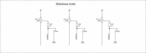Rezystory R4…R7 służą do zasilania wejść procesora, do których są dołączone przyciski. Rezystory R8 i R9 mają za zadanie polaryzację linii MOSI i SCK interfejsu SPI. Za pomocą wyjść PB0…PB2 procesora możemy wybierać przetwornik C/A, do którego wysyłamy dane, natomiast za pomocą portów PA5…PA7 wybieramy układ DDS z którym się komunikujemy.