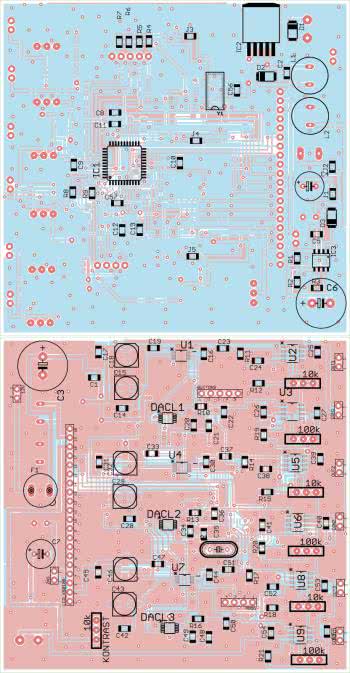 Schemat montażowy 3-kanałowego generatora DDS pokazano na rysunku 2. Większość elementów w projekcie jest typu SMD, dlatego montaż należy rozpocząć od przylutowania przetworników MCP4921 oraz układów AD9833, które są w obudowach MSOP. Do ich przylutowania zaleca się wykorzystanie stacji lutowniczej z grotem typu mini-fala. Następnie należy przylutować mikrokontroler ATmega32, wzmacniacze operacyjne oraz mnożniki analogowe AD835. Po przylutowaniu wszystkich układów, należy sprawdzić, czy nie ma zwarć i czy są przylutowane wszystkie wyprowadzenia. Następnie, należy przylutować wszystkie kondensatory oraz rezystory SMD oraz generator kwarcowy SG-8002JC. Końcowym etapem montażu jest przylutowanie wszystkich elementów przewlekanych (dławiki, kondensatory, bezpiecznik, potencjometry). Montaż można także rozpocząć od przylutowania wszystkich elementów zasilania, a następnie przyłączenia 12 V w celu sprawdzenia czy otrzymujemy –5 V oraz +5 V. Po sprawdzeniu zasilania można przystąpić do montażu pozostałych elementów, ale taka kolejność montażu bardzo utrudnia lutowanie pozostałych elementów SMD, ze względu wystające elementy przewlekane.