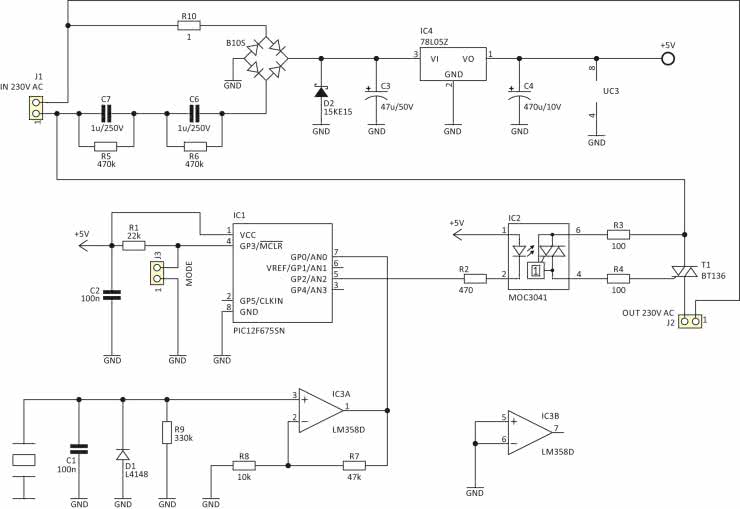 Układ IC1 stanowi serce (logikę) układu. Wejście AN0 skonfigurowane jest jako wejście komparatora (peryferia mikrokontrolera) którego drugie wejście podłączone jest do wewnętrznego napięcia referencyjnego. Wyjście komparatora nadzorowane jest przez mikrokontroler i po spełnieniu kryterium włączenia lampy jest zerowany port GP2 mikrokontrolera, który steruje diodą optotriaka IC2. Zastosowanie optotriaka typu MOC3041 zapewnia komutację w zerze sinusoidy. Rezystory R3 i R4 mają za zadanie ochronę transoptora w przypadku uszkodzenia triaka T1.