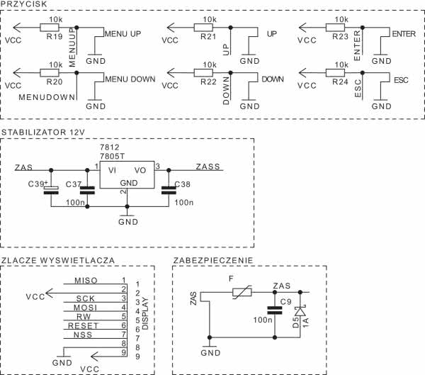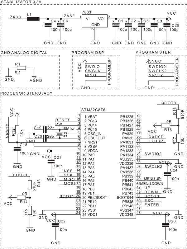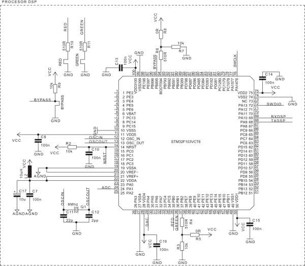 Zasilanie przetworników C/A i A/C procesora STM32F103VCT6 odbywa się za pomocą filtra LC (L2, C7, C17). Rezystory R10, R11 ograniczają prąd płynący przez diodę RG o wspólnej katodzie.
