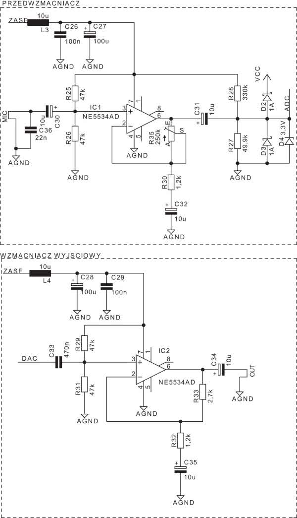 Bezpiecznik F powinien mieć wartość 800 mA. Dioda D5 zabezpiecza cały układ przed odwrotną polaryzacją napięcia zasilającego. Wzmacniacze operacyjne IC1, IC2 (NE5534) są zasilane napięciem asymetrycznym +12 V poprzez filtry LC (L3, C26, C27 oraz L4, C28, C29). Na złącze MIC dociera sygnał z mikrofonu dynamicznego. Kondensator C36 służy do filtrowania zaburzeń odbieranych przez przewód mikrofonowy. Kondensator C30 służy do usunięcia składowej stałej z sygnału dźwiękowego. Rezystory R25, R26 podnoszą sygnał dźwiękowy o składową stałą równą połowie zasilania wzmacniacza operacyjnego. Kondensator C32 służy do ustalenia na nim napięcia 6 V z powodu niesymetrycznego zasilania wzmacniacza operacyjnego. Potencjometr R35 oraz rezystor R30 ustalają wzmocnienie sygnału według zależności ku=(1+R35/R30). Kondensator C31 służy do usunięcia składowej stałej. Sygnał bez składowej stałej następnie jest przesuwany o około +1,5 V za pomocą rezystorów R27, R28 w celu dopasowania do przetwornika A/C. Diody Schottky'ego D2, D3, D4 zabezpieczają przetwornik przed napięciem wyższym od 3,5 V lub mniejszym niż –0,2 V. Sygnał przetworzony z procesora jest pozbawiany składowej stałej za pomocą kondensatora C33, a następnie jest do niego dodawana składowa +6 V za pomocą rezystorów R29, R31. Podniesiony sygnał jest wzmacniany ze wzmocnieniem ku=3,25 ustalonym za pomocą rezystorów R32, R33. Kondensator C34 usuwa ze wzmocnionego sygnału składową stałą. Złącze OUT służy do przylutowania gniazda wyjściowego, do którego podłącza się wzmacniacz.
