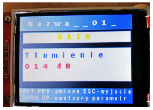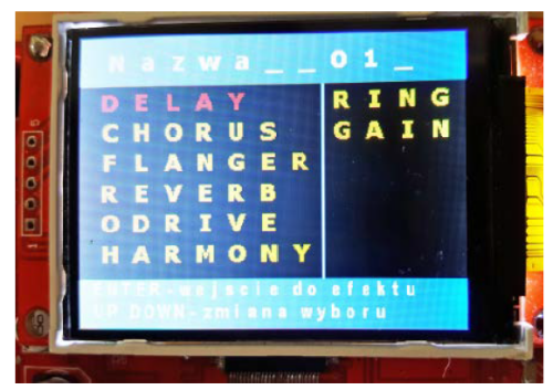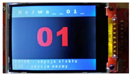 Do poruszania się po menu służą przyciski ENTER, ESC, UP, DOWN oraz przyciski, które służą do zmiany numeru presetu, tj. NEXT, PREV. Na dolnym pasku wyświetlacza pojawiają się komunikaty ułatwiające poruszanie się po menu. Na fotografii 6 pokazano menu główne, które pojawia się po załadowaniu urządzenia. Na środku wyświetlacza widnieje numer aktualnie wybranego presetu. Aby zmienić numer presetu, należy nacisnąć NEXT lub PREV. Aby wejść do podmenu wyboru edycji efektu, należy nacisnąć ENTER. Naciśnięcie przycisku ESC powoduje załączenie edycji nazwy danego presetu. Przy załączeniu edycji nazwy, naciskając przyciski UP, DOWN, należy edytować nazwę efektu. Aby wyjść z edycji nazwy, należy nacisnąć przycisk ENTER lub ESC. Naciśnięcie przycisku ENTER powoduje wyjście bez zapisu nazwy tzn. przy ponownym uruchomieniu efektu na danym numerze presetu będzie widnieć stara nazwa. Wyjście z edycji nazwy poprzez naciśniecie ESC powoduje zapisanie do pamięci flash efektu nowej nazwy, dzięki czemu po ponownym uruchomieniu efektu będzie widoczna na danym presecie nowa nazwa.
