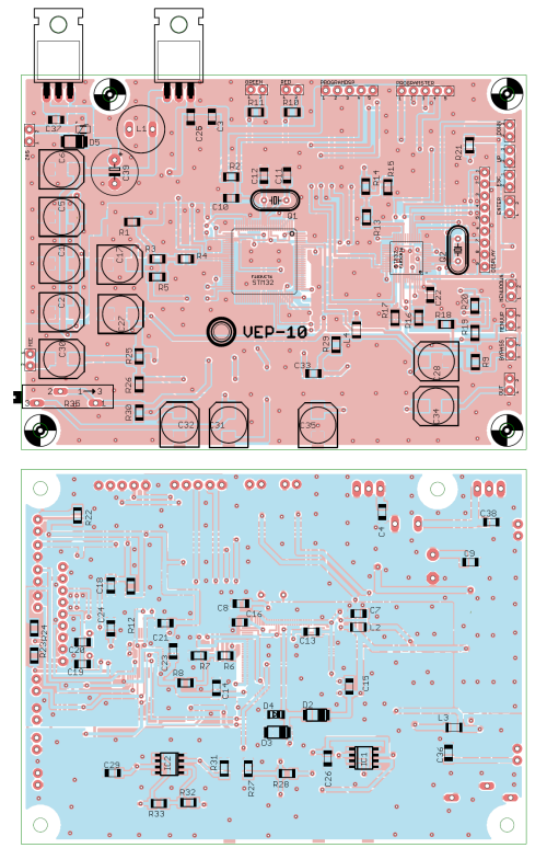 Schemat montażowy efektu VFP-10 pokazano na rysunku 2. Podczas projektowania płytki drukowanej puste miejsca pokryto powierzchnią masy w celu poprawienia ekranowania. Ponadto masę rozdzielono na cyfrową oraz analogową i połączono w jednym punkcie (R1). W celu lepszego połączenia masy na górze płytki z masą na spodzie wykonano dodatkowe przelotki.