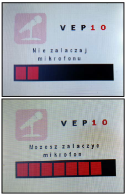 Przed pierwszym uruchomieniem w układzie z mikrofonem oraz wzmacniaczem należy wyciszyć kanał, który jest podłączony do efektu na wzmacniaczu, wyłączyć mikrofon, aby uniknąć niepotrzebnych sprzężeń. Należy pamiętać, aby przy każdym uruchamianiu efektu wyłączyć mikrofon lub odłączyć go od wejścia MIC efektu w celu prawidłowej kalibracji. W trakcie ładowania ustawień efektu na wyświetlaczu zostanie wyświetlony komunikat o możliwości przyłączenia mikrofonu (rysunek 5).