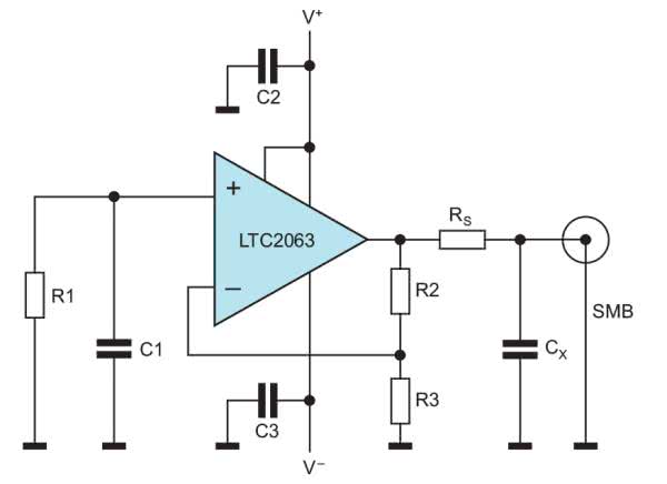 Rezystancja opornika na wyjściu (RS) – 10 kΩ – może wydawać się wysoka, ale z uwagi na wysoką impedancję wyjściową wzmacniacza nawet taki opór nie zapewni pełnej izolacji wyjścia op-ampa od pojemności obciążenia. Jednakże w tym układzie pojemność wyjściowa powinna być postrzegana jako istotna cecha projektowa, nie zagrożenie dla stabilności. Op-amp widzi na wyjściu RS (10 kΩ) i CX (50 nF) podłączone pomiędzy wyjście a masę. Kondensator CX będzie oddziaływał z obwodem LTC2063, powodując powstawanie maksimów w odpowiedzi częstotliwościowej układu. Maksima te można wykorzystać do poszerzenia płaskiej części charakterystyki generatora. Przyjmuje się, że układ będzie podłączony do obciążenia o wysokiej impedancji (Z>100 kΩ), ponieważ obciążenie o niższej impedancji znacznie zmniejszy poziom wyjściowy.