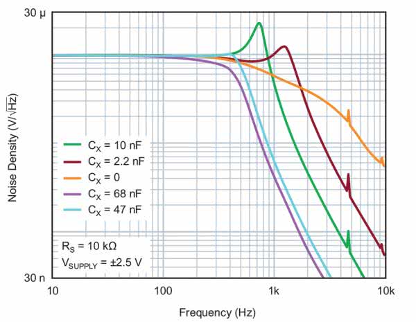 Gęstość spektralną szumu na wyjściu w funkcji pojemności CX (przy RS=10 kΩ i zasilaniu ±2,5 V) pokazano na rysunku 3.