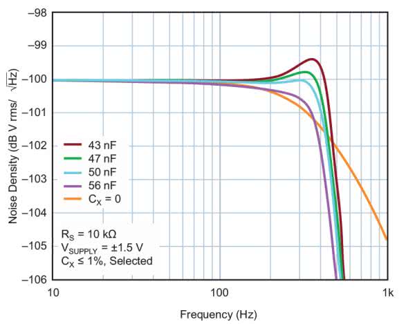 Parametry układu scalonego są ściśle związane z pobieranym prądem. Elementy o niskim prądzie zasilania mogą wymagać nieco większego CX, podczas gdy części o wysokim prądzie zasilającym najprawdopodobniej wymagają mniej niż 30 nF przy jednoczesnym osiągnięciu szerszej, płaskiej charakterystyki. Pokazane poniżej wykresy pokazują, w jaki sposób wartość CX wpływa na odpowiedź częstotliwościową w zamkniętej pętli sprzężenia zwrotnego układu.