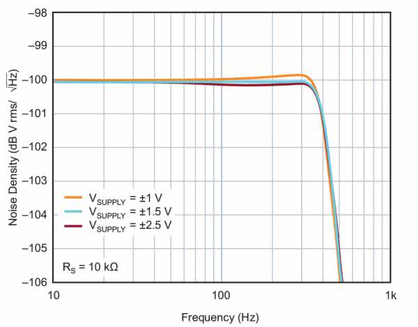 Gęstość spektralna szumu na wejściu LTC2063 wynosi około 200 nV⁄√Hz, a szum jest przewidywalny i płaski w całym zakresie częstotliwości (w granicach ±0,5 dB). Zakładając, że poziom szumu LTC2063 wynosi 50% szumu termicznego opornika, a szum napięcia wzmacniacza operacyjnego zmienia się o 5%, gęstość szumu na wyjściu zmienia się tylko o 1%.