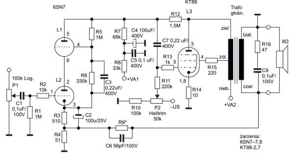 - R1: 100 Ω/10 W dobrany do prądu spoczynkowego lamp mocy 60 mA oraz napięcia anodowego 340 V