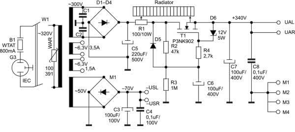 Schemat zasilacza został pokazany na rysunku 2. Daje on napięcie anodowe o wartości około 340 V poprzez układ softstartu, napięcie –70 V do lamp sterujących KT88 oraz dwa napięcia żarzenia dla lamp 6SN7 i KT88. Nie można zapomnieć o zastosowaniu warystora w pierwotnym uzwojeniu trafo sieciowego, gdyż przepięcia uszkadzają tranzystor MOSFET w układzie softstartu.