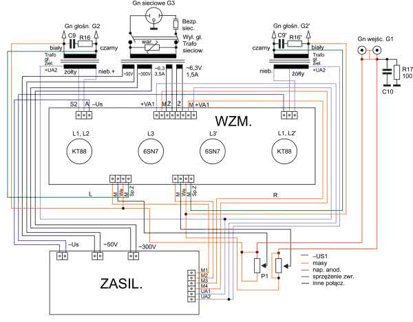 Wzmacniacz mocy pracuje w klasie A w układzie ultralinearnym. Ma dwa lokalne sprzężenia zwrotne, realizowane za pomocą elementów R5 oraz R12.