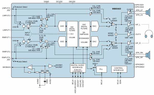 Strukturę wewnętrzną kodeka WM8960 pokazano na rysunku 1. Układ posiada w torze wejściowym trzy wejścia analogowe LINPUT1...3 z wbudowanymi regulowanymi wzmacniaczami do współpracy ze źródłami o poziomie mikrofonowym i liniowym, wbudowany automatyczny regulator wzmocnienia ALC/limiter, bramkę szumów sumator sygnałów wejściowych, a w torze wyjściowym mikser z możliwością odsłuchu wejść, wzmacniacz słuchawkowy (HP) z wyjściem linowym i dwukanałowy wzmacniacz mocy 2×1 W współpracujący bezpośrednio z głośnikami (SPK).