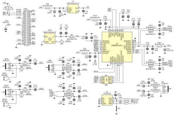 Wszystkie sygnały wejściowe przed doprowadzeniem do WM8960 podlegają filtracji RF w filtrach dolnoprzepustowych PI, składających się z kondensatorów i dławika ferrytowego (np. C8, 9, FB4). Tor mikrofonowy podłączony jest do wejścia LIN/RIN U2.