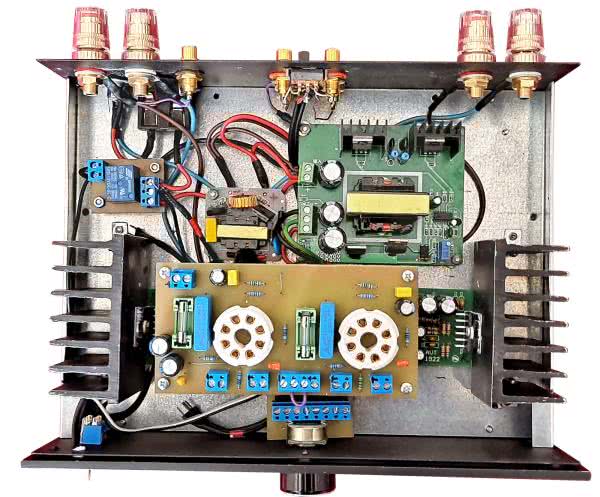 Wnętrze wzmacniacza zostało pokazane na fotografii 1. Konstrukcja składa się z ośmiu modułów w postaci oddzielnych płytek PCB. Poszczególne moduły zostały oznaczone tak jak na rysunku 1. Na blok zasilania składają się: