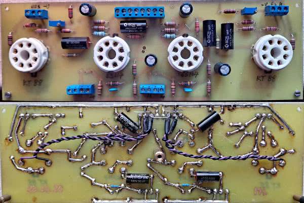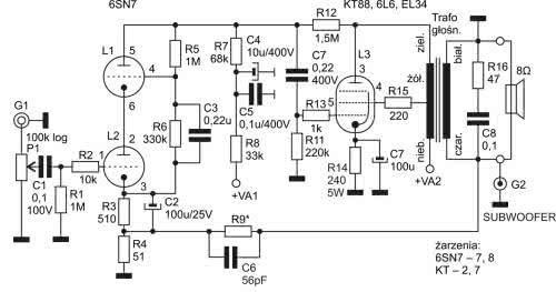 - R1: 100 Ω 10 W (dobrany do napięcia anodowego UA1, UA2 = 320 V, przy prądzie spoczynkowym lamp mocy = 70 mA)