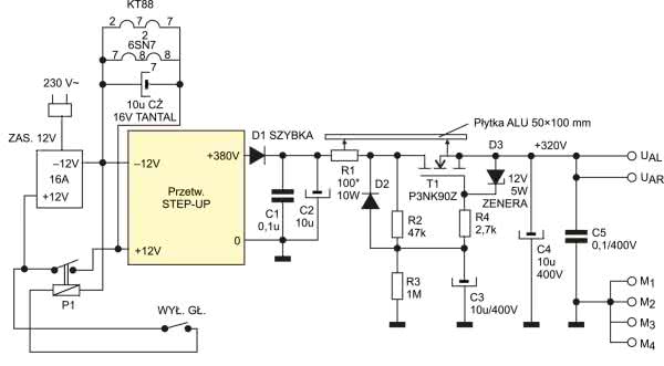 Schemat bloku zasilającego został pokazany na rysunku 2. Wysokie napięcie zasilające obwody anodowe jest uzyskiwane z przetwornicy DC/DC dostępnej w formie gotowego modułu. Pracuje ona z częstotliwością 20 kHz i jako element impulsowy generuje niewielkie straty mocy. Zasilanie przetwornicy jest dostarczane z zewnętrznego zasilacza 230 V AC/12 V DC o wydajności 16 A. Na wyjściu przetwornicy uzyskiwane jest napięcie o wartości ok. 380 V AC, które trafia na szybką diodę prostowniczą oraz niewielką pojemność 10 μF. W dalszej kolejności wyprostowane napięcie podawane jest przez rezystor R1 dobrany tak, aby na wyjściu zasilacza, w trakcie pracy wzmacniacza, było napięcie 320 V.