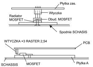 Ostatnim blokiem zasilacza jest układ soft-startu. Elementy R2, C3 i T1 oraz kila elementów pomocniczych, powodują łagodne narastanie napięcia anodowego. Nie jest potrzebne narastanie o długim czasie, wystarczy ułamek sekundy. Bardzo szkodliwe jest tylko gwałtowne podanie napięcia na zimne katody lamp mocy i właśnie przed tym ma zabezpieczyć soft-start. Na uwagę zasługuje tylko sposób montażu tranzystora T1 – został pokazany na rysunku 3. Ciepło z tranzystora odbiera płytka z blachy aluminiowej o powierzchni kilkudziesięciu centymetrów kwadratowych przykręcona do spodu obudowy z użyciem pasty sylikonowej. Tranzystor połączony jest z płytką drukowaną poprzez wtyczkę rastrową z trzema wyprowadzeniami przylutowanymi od spodu płytki drukowanej, natomiast do blachy aluminiowej jest przykręcony z zastosowaniem podkładki i tulejki izolacyjnej.