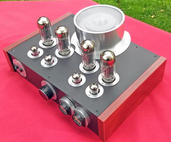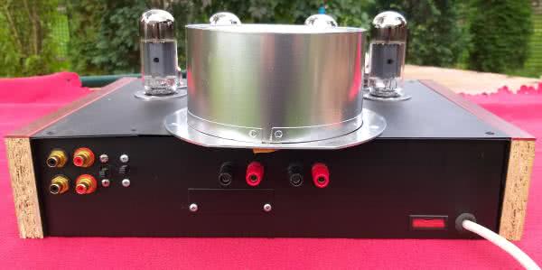 Gotowy wzmacniacz pokazany jest na fotografii tytułowej. Na fotografii 3 pokazano konstrukcję górnej ściany obudowy z miejscami na lampy oraz wentylowaną osłoną transformatora.