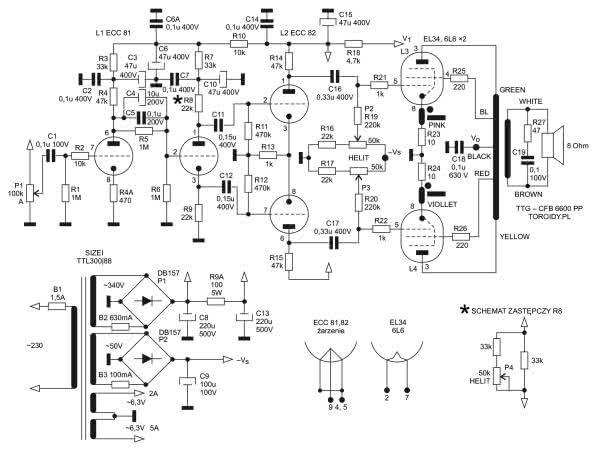 Można pokusić się o zminimalizowanie zniekształceń nieliniowych zmieniając wartość rezystora anodowego R8 22 kΩ w drugiej lampie tak jak pokazuje schemat zastępczy dla R8. Trzeba wysterować wzmacniacz sygnałem prostokątnym o częstotliwości 100 Hz prawie do pełnego wysterowania i słuchając w głośniku minimalnego przesterowania sygnału należy regulować wartość R8. Można oczywiście podłączyć miernik zniekształceń harmonicznych i uzyskać jeszcze lepszy efekt.