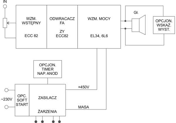 Schemat blokowy wzmacniacza został pokazany na rysunku 1 a dokładny schemat elektryczny pokazuje rysunek 2.