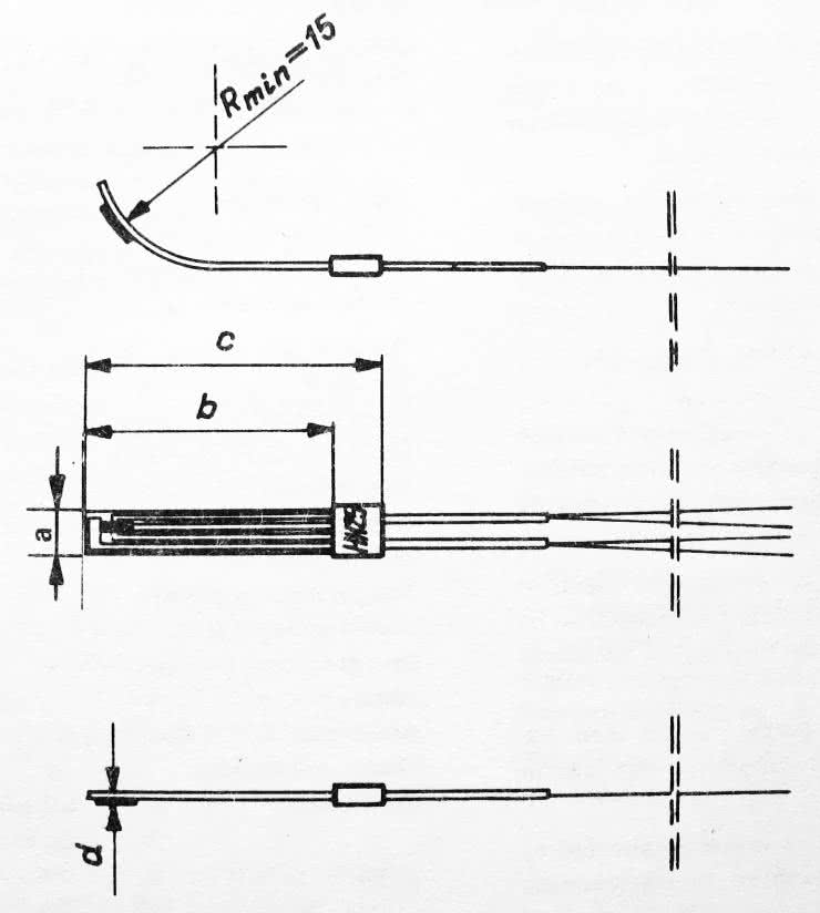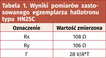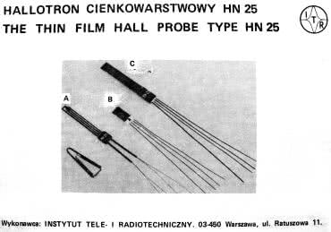 Sondę hallotronową najlepiej jest wykonać za pomocą hallotronu cienkowarstwowego typu HN25 produkcji Instytutu Tele- i Radiotechnicznego w Warszawie. Tego typu hallotrony nie są już produkowane, ale w dalszym ciągu istnieją stare zapasy. Ich parametry odbiegają nieco od wartości katalogowych, ale zawsze można skorygować wynik pomiaru potencjometrem montażowym P2 typu helitrim. Na rysunkach 2, 3 i 4 pokazano oryginalną dokumentację techniczną tego hallotronu.