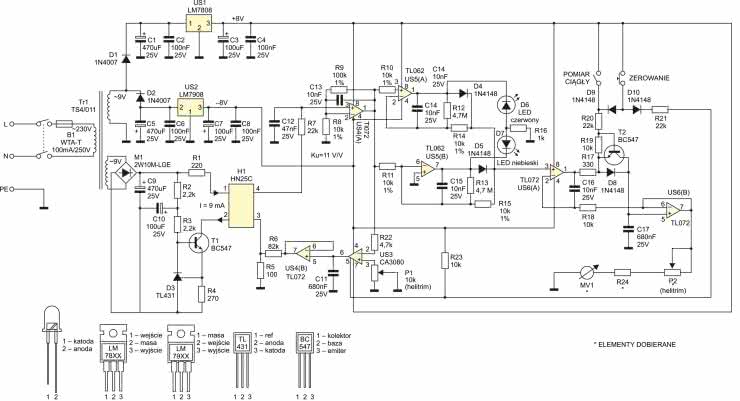 Drugie uzwojenie transformatora zasila jednopołówkowy prostownik oraz filtr ze scalonymi stabilizatorami LM7808 oraz LM7908, dostarczający dwóch symetrycznych względem masy napięć potrzebnych do zasilania układu. Takie rozwiązanie upraszcza konstrukcję zasilacza i jest możliwe do zastosowania w tej aplikacji ze względu na bardzo mały pobór prądu przez układ pomiarowy.