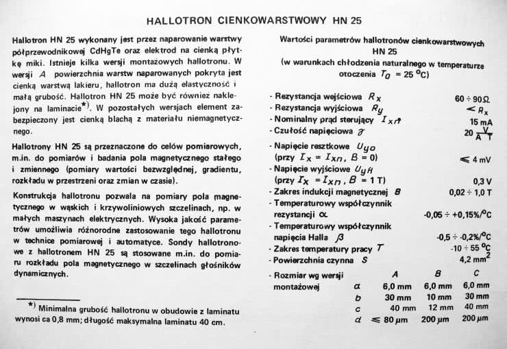 Hallotron cienkowarstwowy typu HN25 charakteryzuje się bardzo małą grubością oraz zakresem pomiarowym odpowiednim dla wykonywania pomiarów indukcji w szczelinach powietrznych obwodów magnetycznych głośników. Należy jednak obchodzić się z nim bardzo ostrożnie, ponieważ ten rodzaj czujnika jest bardzo delikatny i podatny na uszkodzenia mechaniczne. Połączenia lutowane wyprowadzeń należy wykonywać możliwie krótkotrwale, aby nie przegrzać struktury wewnętrznej hallotronu. Sygnał należy wyprowadzić czterożyłowym przemysłowym przewodem ekranowanym. Ekran należy podłączyć do potencjału masy. Hallotron najlepiej zabudować w obudowie flamastra, zabezpieczając przewód sygnałowy klejem na ciepło oraz dodatkowo rurą termokurczliwą w taki sposób, aby uniemożliwić jego przypadkowe wyrwanie z obudowy. Pomiary należy wykonywać, zachowując szczególną uwagę na to, aby nie złamać hallotronu podczas wkładania go do szczeliny powietrznej obwodu magnetycznego badanego głośnika.