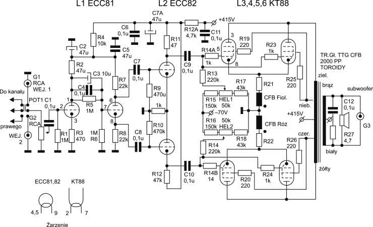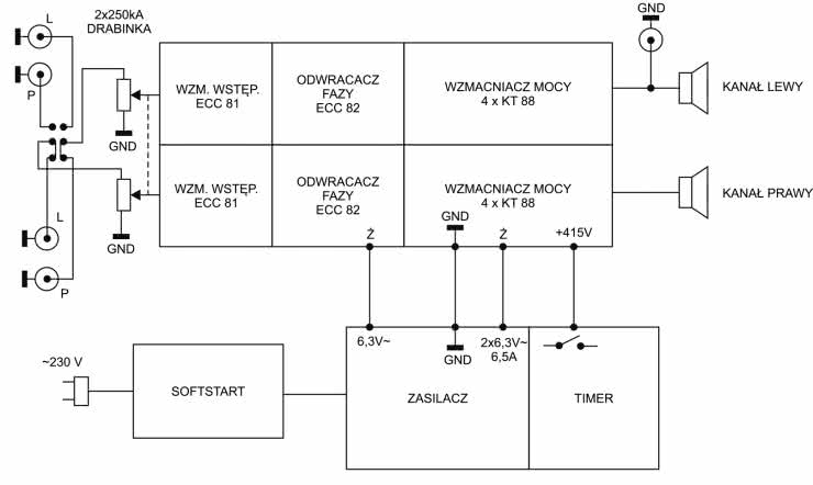 Schemat blokowy urządzenia został pokazany na rysunku 1. Układ składa się z dwóch bloków. Pierwszy to płyta PCB na której znajdują się dwa kanały wzmacniacza. Schemat ideowy tego bloku został pokazany na rysunku 2. Każdy z nich ma wzmacniacz wstępny na lampie ECC81, odwracacz fazy na lampie ECC82 oraz podwójny układ lamp mocy z lampami KT88 dobranymi w kwadry – a w tym przypadku – oktawy.