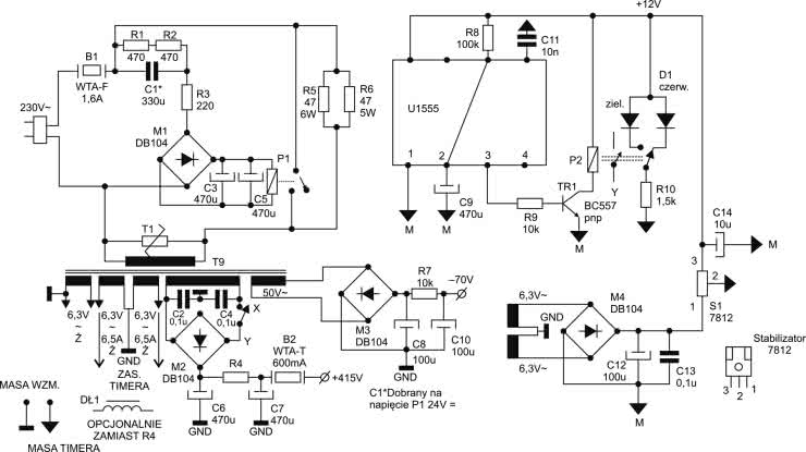- wyjście 50 V, 0,1 A służy do zasilania prostownika napięcia ujemnego (M3),