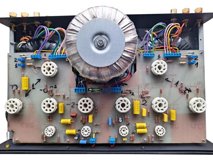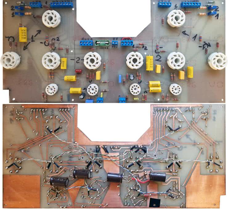Wzmacniacz wstępy wraz z odwracaczem fazy to typowy układ z lat pięćdziesiątych ubiegłego wieku opisany szczegółowo w poprzednim artykule. Wzmacniacz mocy pracuje w klasie AB w układzie ultralinearnym gdzie siatki drugie połączone są przez rezystory ograniczające z odczepami w uzwojeniu pierwotnym transformatora głośnikowego. Powoduje to zwiększenie mocy wyjściowej i zmniejszenie zniekształceń nieliniowych.