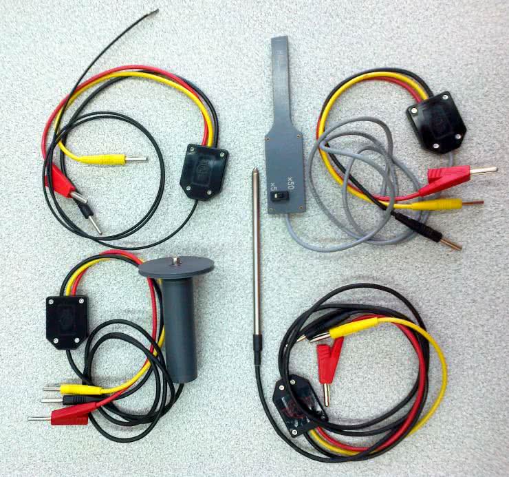 Na fotografii 3 pokazano przykładowe czujniki analogowe, w kolejności od góry: światłowodowy czujnik oświetlenia (w zakresie VIS), czujnik pola magnetycznego (hallotron), czujnik położenia kątowego i sondę temperatury. Czujniki analogowe standardowo wyposażone są we wtyki bananowe w rozmiarze 4 mm. Do zasilania czujników służy napięcie +5 V, podawane na wtyki czerwony i czarny z karty UIA/UIB, zaś sygnał wyjściowy dostępny jest na wtyku żółtym. Czujnik analogowy podłącza się do jednego z wejść ADC konsolki analogowej.
