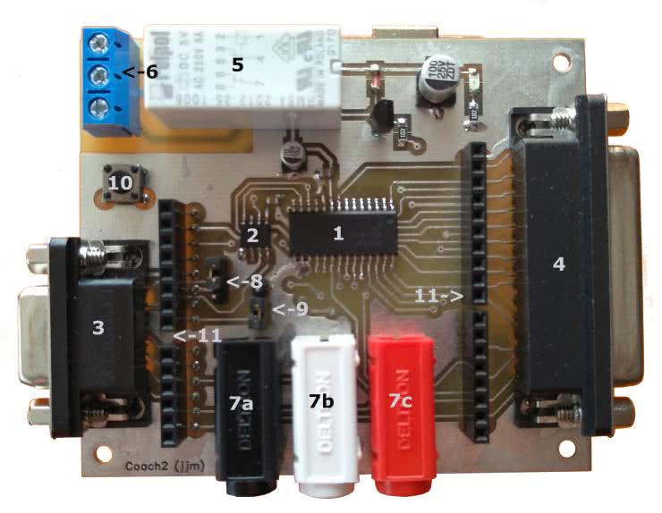 Na interfejs nakładki Coach2 składają się dwa gniazda DB9 (J1, numer #3 na fotografii 1) i DB25 (J4, #4) - analogiczne do tych, w które wyposażony jest oryginalny interfejs UIA/UIB - a także gniazda bananowe 4 mm (J5, J6, J7, #7) do czujników analogowych oraz złącze śrubowe ARK (J11, #6) do miniaturowego przekaźnika RM84 (U3, #5).