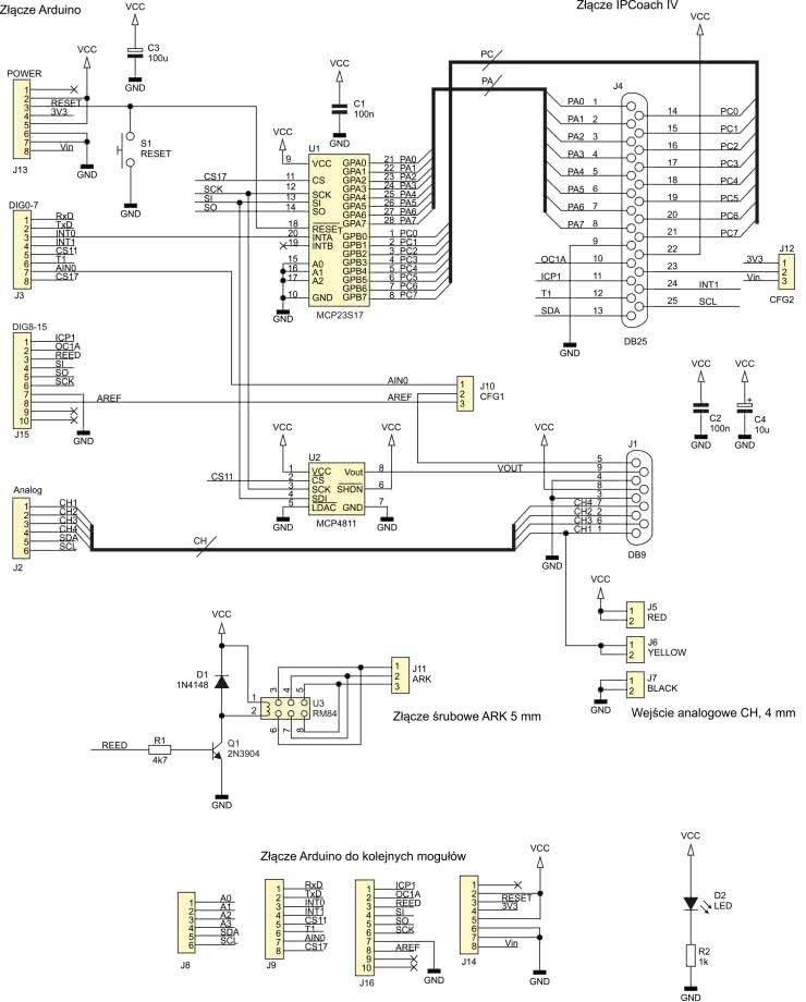 Do gniazda DB25 doprowadzone są sygnały z portów cyfrowych (PORTA i PORTC) i wielofunkcyjnego portu PORTX. W systemie IP-Coach i na karcie UIA/UIB sygnały cyfrowe sterowane były przez układ I8255, który umożliwiał jedynie sterowanie portami PORTA jako całością i PORTC jako dwiema niezależnymi połówkami. W przypadku płytki Coach2 sygnały cyfrowe sterowane są już przez 16-bitowy ekspander MCP23S17 (U1, #1). Możliwe jest więc niezależne sterowanie każdym bitem portów cyfrowych oraz generowanie przerwań przy zmianie stanu poszczególnych bitów PORTA i PORTC. Układ MCP23S17 komunikuje się z modułem głównym Arduino za pomocą interfejsu SPI.
