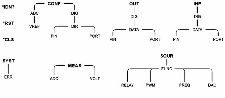 Przed użyciem standardu SCPI w płytkę należy jednorazowo wgrać szkic SCPICoach2.ino. Na rysunku 4 można zobaczyć drzewo dostępnych rozkazów SCPI.