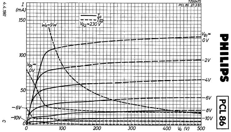 Na rysunku 2 widzimy charakterystykę prądowo-napięciową lampy PCL86. W zależności od napięcia anodowego obieramy punkt pracy lampy. Według charakterystyki przy napięciu około 250 V spadek napięcia na rezystorze katodowym musi wynosić ok. 8 V. Korzystając z prawa Ohma i wartości prądu przepływającego przez lampę oraz transformator głośnikowy, jesteśmy w stanie wyznaczyć punkt pracy.