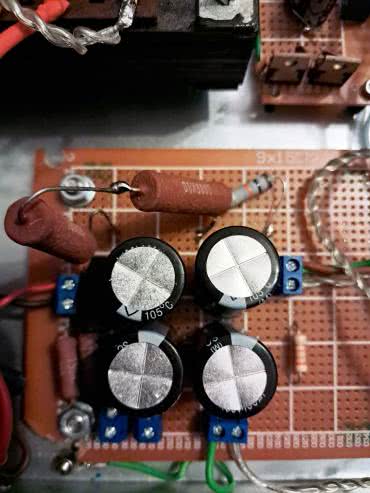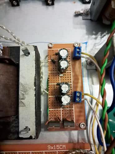 Żeby przystosować układ do współczesnych warunków, podłączając transformator TS40/29/676, zamieniłem uzwojenia pierwotne (sieciowe) z wtórnym, dzięki czemu uzyskałem niższe napięcie anodowe lamp i mniejsze straty energii. Nie tracą one na mocy wyjściowej ani stabilności. Napięcie wyjściowe w tej konfiguracji wynosi około 210 VAC bez obciążenia, a po wyprostowaniu osiąga wartość około 300 VDC. Aby zmniejszyć tętnienia na linii zasilającej, zdecydowałem się na układ wielostopniowego zasilacza, opartego na filtrach RC (ma to na celu poprawę jego parametrów). Następnie rezystory R11, R12 i R13 obniżają napięcia do pożądanej wartości (około 250 V). Zmontowany blok zasilacza anodowego można zobaczyć na fotografii 1.