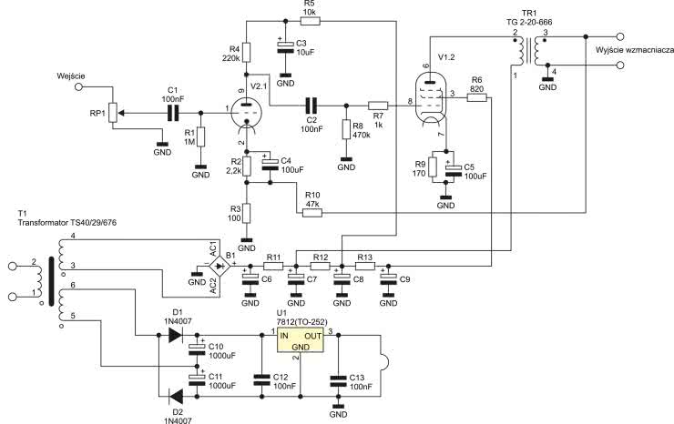 Schemat układu można zobaczyć na rysunku 1. Wzmacniacz został zbudowany na dwóch lampach PCL86 pracujących w klasie A. Każda z nich jest lampą złożoną (kombinowaną) - oznacza to, że w jednej bańce są w istocie zawarte dwie lampy (trioda i pentoda). Stopień wejściowy wzmacniacza został wykonany na triodzie, natomiast stopień końcowy - na pentodzie. Sygnał audio jest podawany na wejście przez potencjometr, a kondensator C1 odcina składową stałą. Następnie sygnał wędruje na siatkę triody, gdzie napięcie jest wzmacniane. Rezystory R2 i R3 ustalają punkt pracy wzmacniacza. Podłączony równolegle kondensator C4 zwiera składową zmienną prądu katodowego. Wzmocniony sygnał z anody triody - sprzężony za pomocą C2, R8 i R7 (rezystora antywzbudzeniowego) - trafia na siatkę pentody. Opornik R9 ustala punkt pracy pentody, która z kolei obciążona zostaje transformatorem Tg2-20-666 firmy Zatra. Transformatory tego typu były montowane w magnetofonach ZK120 i ZK140 produkcji ZRK. Uwaga: Należy zwrócić uwagę na zaciski uzwojenia wtórnego. Jeśli słyszymy niepokojące dźwięki w głośniku, trzeba zamienić koniec uzwojenia. Siatka druga jest podłączona przez rezystor R6 do zasilacza anodowego, a jej celem jest ograniczenie prądu siatki. Rezystor R10 odpowiada za sprzężenie zwrotne.