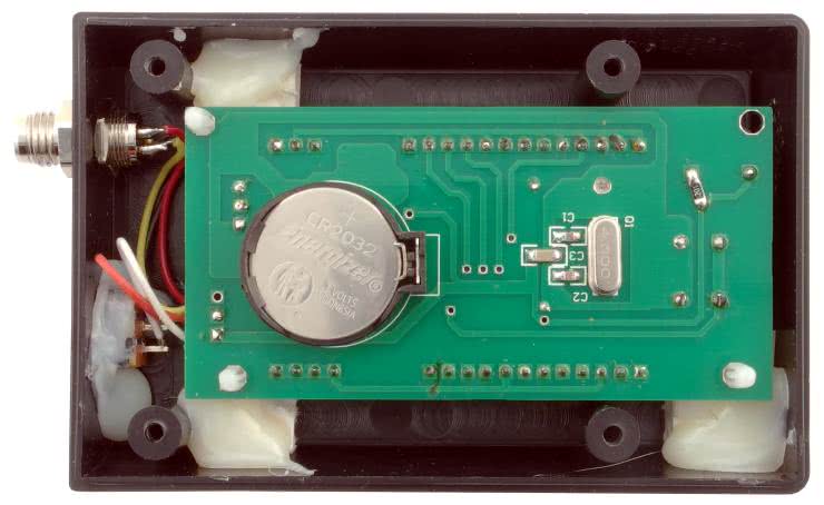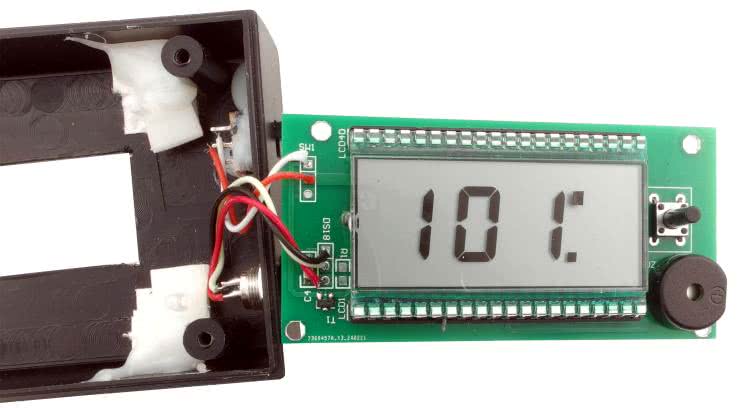 Gniazdo do podłączenia czujnika temperatury podłączyłem za pomocą przewodów. Zastosowałem 3-pinowe, okrągłe gniazdo M8, ale można wykazać się tu inwencją. Wygodnym rozwiązaniem byłoby też złącze mini-jack stereo, choć należałoby pamiętać o tym, aby wyjmować i wkładać wtyk przy wyłączonym zasilaniu. Na końcu, po sprawdzeniu poprawności montażu (mikrokontroler wymaga zwrócenia szczególnej uwagi na ewentualne zwarcia wyprowadzeń), należy włożyć wyświetlacz w podstawkę, zachowując przy tym ostrożność: jest to szklany element i łatwo go uszkodzić. Jeśli z jakiegoś powodu zajdzie konieczność zdemontowania wyświetlacza, to w żadnym wypadku nie należy podważać go śrubokrętem- metalowy przedmiot łatwo uszczerbi szkło. Lepsza w tym celu okaże się drewniana wykałaczka lub patyczek po lodach.