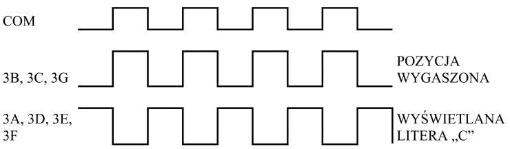 Na segmentach, które nie są aktywne, powinien znajdować się taki sam przebieg, jak na wejściu COM (w fazie), a na segmentach aktywnych (np. segmentach 3A, 3D, 3E, 3F tworzących literę C – stopnie Celsjusza) musi znaleźć się przebieg z portu COM w odwróconej fazie (rysunek 4). Nieco „ekwilibrystyki” wymaga zapewnienie, aby statycznie wyświetlana wartość na wyświetlaczu miała odpowiednie przebiegi o częstotliwości „niewidzialnej” dla oka ludzkiego. Wszystkie nieużywane segmenty wyświetlacza (dwukropek, AC itp.) są połączone wspólnie do pinu COM. Pozostawienie ich „w powietrzu” mogłoby spowodować aktywowanie segmentu na skutek gromadzenia się ładunku elektrostatycznego.