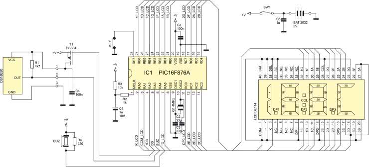 Układ zbudowany został w oparciu o mikrokontroler jednoukładowy PIC16F876A, którego większość wyprowadzeń steruje siedmiosegmentowym wyświetlaczem LCD 3 i 1/2 cyfry. Schemat układu znajduje się na rysunku 1.