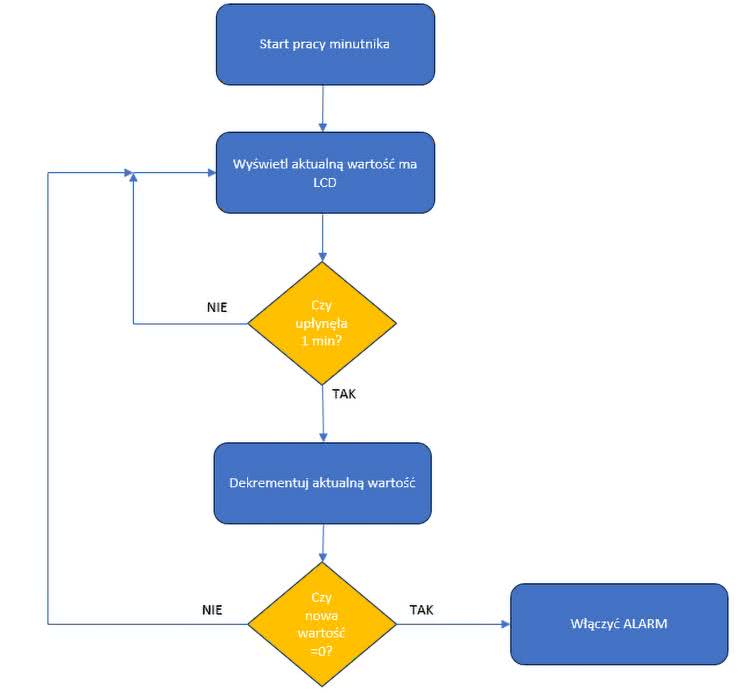 Poza wyświetlaczem do mikrokontrolera podłączony jest przycisk push-button, w którym jako rezystor podciągający zastosowany został wewnętrzny pull-up mikrokontrolera. Ponadto zastosowano sygnalizator piezoelektryczny bez wbudowanego generatora. Równolegle do sygnalizatora podłączony został natomiast rezystor, który „łagodzi” charakter pojemnościowy tego obciążenia i stanowi element opcjonalny – przy niektórych typach sygnalizatorów nie jest konieczny.