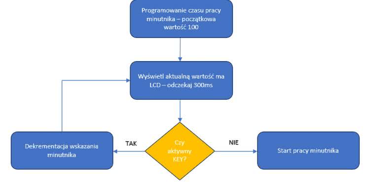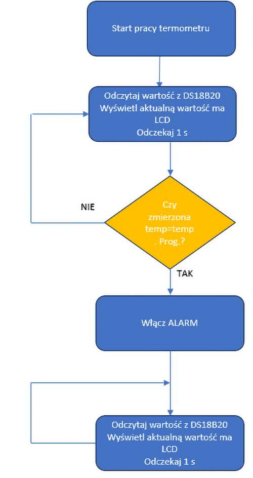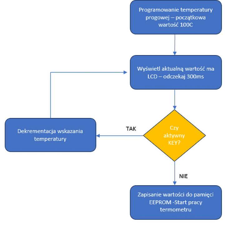 Następnie testowany jest przycisk KEY (push-button). Jeśli po włączeniu układu zostanie on przyciśnięty, urządzenie przejdzie do trybu programowania ustawień. Wtedy wyświetli się wartość 100, która będzie zmniejszać się do chwili zwolnienia przycisku. Urządzenie zapamięta wówczas tę wartość i zacznie pracę. Jeśli wybraliśmy tryb pracy termometru i zaprogramowaliśmy np. 90°C, to zacznie on wyświetlać bieżącą temperaturę czujnika (odświeżaną co 1 sekundę), a w chwili przekroczenia zaprogramowanego progu (90°C) włączy sygnalizator dźwiękowy BUZ. Po wyłączeniu napięcia zasilania i ponownym włączeniu bez programowania (tzn. gdy przycisk jest zwolniony w chwili włączenia zasilania), temperatura progowa wywołująca włączenie alarmu będzie wartością ostatnio zaprogramowaną, pobraną z pamięci EEPROM. Jeśli więc zazwyczaj jest to wartość stała, nie ma konieczności programowania jej każdorazowo.