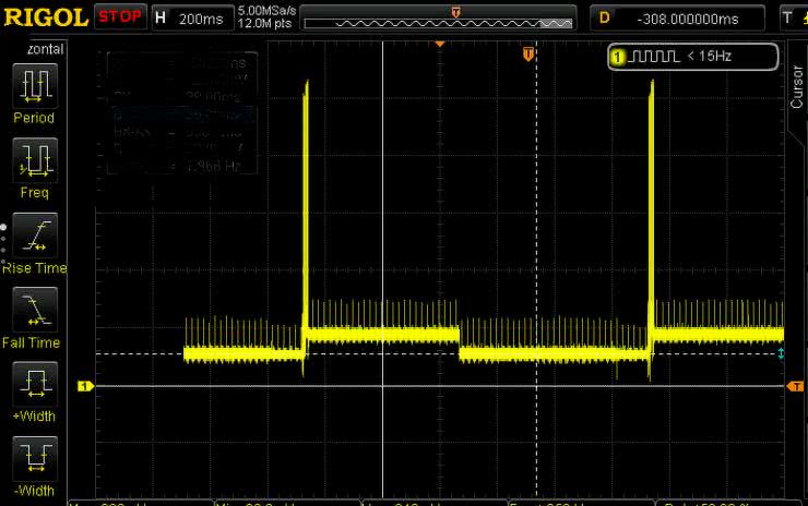 Układ pracujący w trybie minutnika pobiera z baterii około 620 μA, co – przy założeniu, że bateria ma około 200 mAh pojemności – powinno wystarczyć na 322 godziny pracy układu. W trybie pracy termometru sytuacja nieco się komplikuje z uwagi na periodyczne zmiany pobieranego prądu, związane z włączaniem czujnika temperatury i transmisją danych. Wystarczy spojrzeć na przebieg prądu umieszczony na rysunku 5. Zadając sobie nieco trudu, można wyliczyć, że średni prąd wynosi w tym przypadku około 900 μA, co wystarcza na 222 godziny pracy przy zastosowaniu takiej samej baterii.