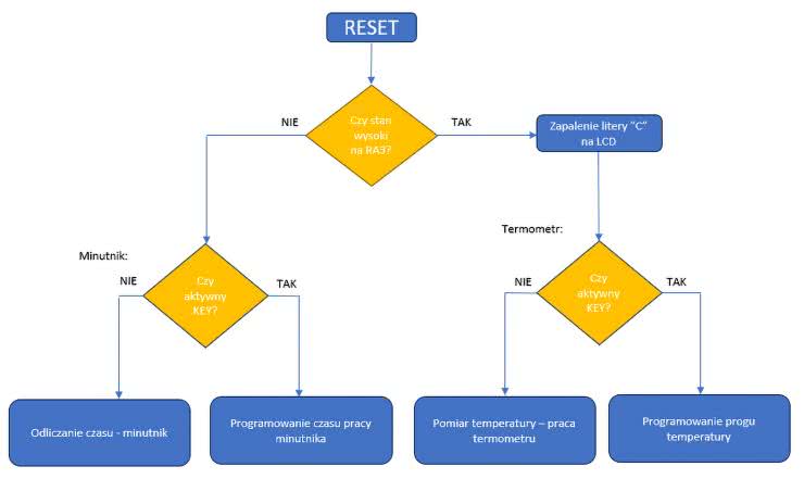Po włączeniu zasilania i restarcie mikrokontrolera testowany jest port RA3 (szyna 1-Wire). Jeśli wykryty zostaje stan niski (brak podłączonego czujnika temperatury) – układ przechodzi do trybu pracy minutnika. Jeśli natomiast na porcie RA3 procesor wykryje stan wysoki – układ będzie pracował w trybie termometru. Wystarczy więc odpiąć od gniazda czujnik temperatury wraz ze znajdującym się we wtyczce rezystorem R1 i układ „wstanie” jako minutnik.