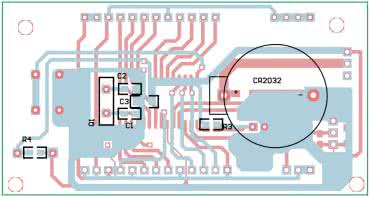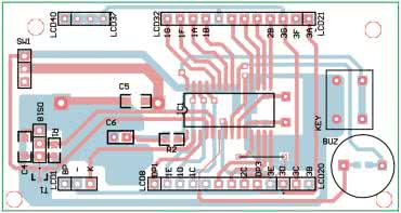 Układ zmontowany został na dwustronnej płytce PCB o wymiarach 80 mm x 40 mm, przy użyciu elementów SMD i THT. Najwygodniej byłoby wgrać program do mikrokontrolera przed montażem, ale to wymaga specjalistycznej, drogiej podstawki. Można więc wlutować niezaprogramowany układ na płytkę PCB, a następnie czterema przewodami podłączyć nasz mikroprocesor do programatora, używając pól lutowniczych ścieżek podłączonych do mikrokontrolera (GND, MCLR – pin rezystora R2, RB6 i RB7 – pola lutownicze przeznaczone do przycisku i pinu 9 wyświetlacza). Po zaprogramowaniu mikrokontrolera należy odlutować przewody, wlutować pozostałe elementy SMD, a następnie THT. Do podłączenia wyświetlacza dobrze jest użyć podstawki – można w tym celu zastosować podstawkę do układów scalonych w obudowie DIP40 (odcinając dwa rzędy wyprowadzeń od łączących je poprzeczek), tak aby dało się ją wlutować do PCB. Nieużywane piny wyświetlacza – oznaczone jako NC – nie są podłączone do układu. Należy spod tych pinów usunąć złącza podstawki (brak odpowiednich otworów w PCB wynika z umieszczenia w tym obszarze innych ścieżek).