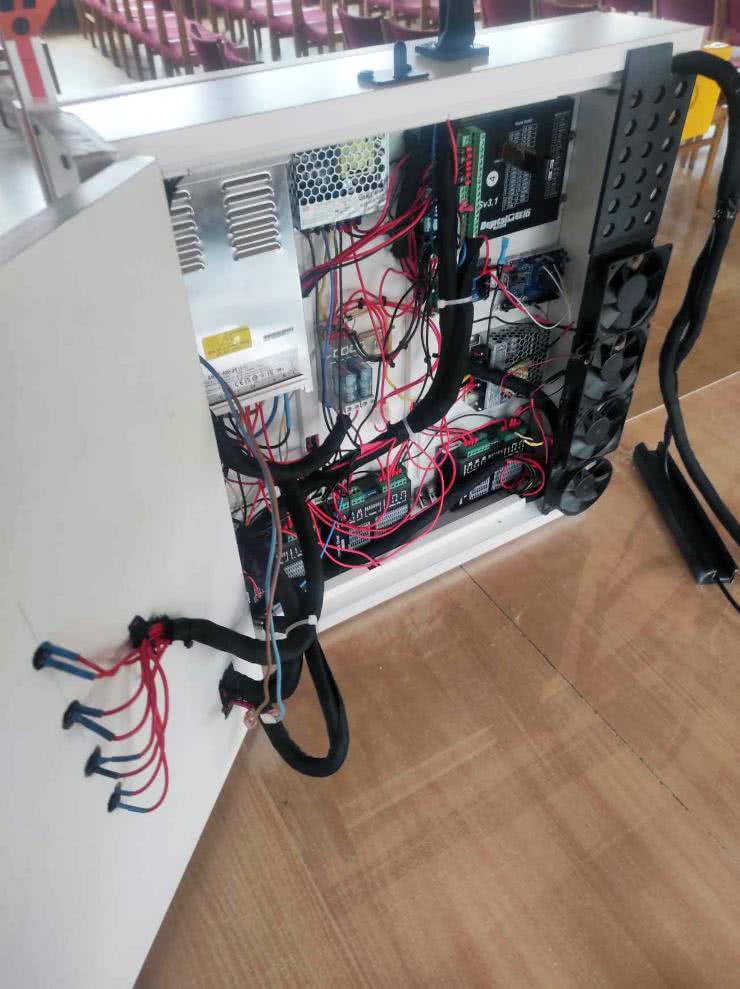 Większość bloków funkcjonalnych, poza samymi silnikami, znajduje się w zamykanej szafie sterowniczej, widocznej na fotografii 1. Jedynymi elementami na stałe wystającymi z szafy są: panel dotykowy kontrolera DDCSV oraz puszka z wyłącznikiem bezpieczeństwa.